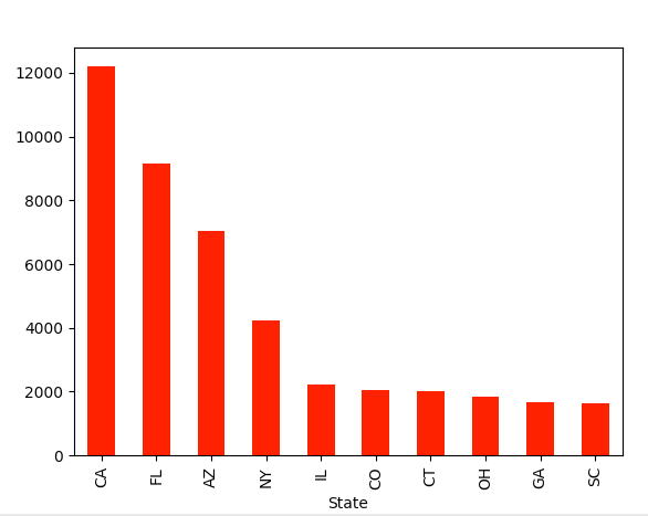 You can use the plotting tool matplotlib to chart the data: df.plot(kind=’bar’,x=’State’,y=’Number of Prescriptions’,color=’red’)